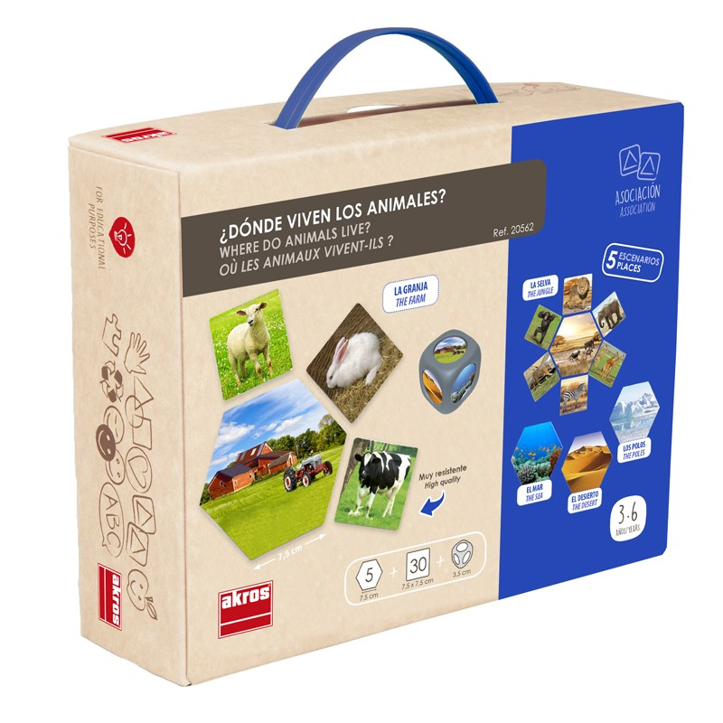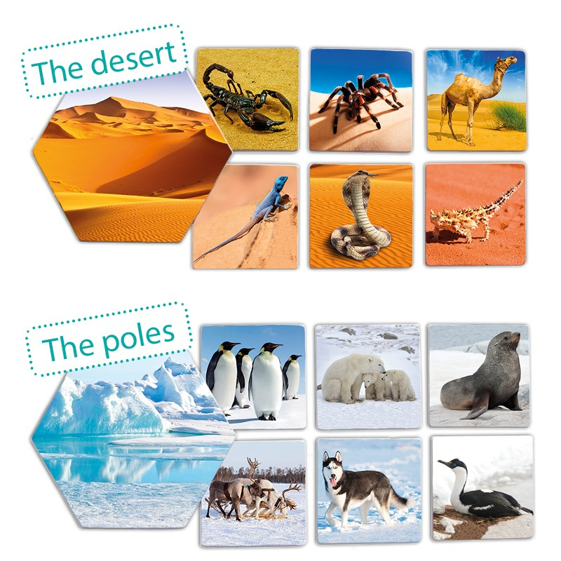 Joc de asociere cu scopul de a învăţa unde trăiesc animalele: la fermă, în junglă, în deşert, la poli sau în apă.
