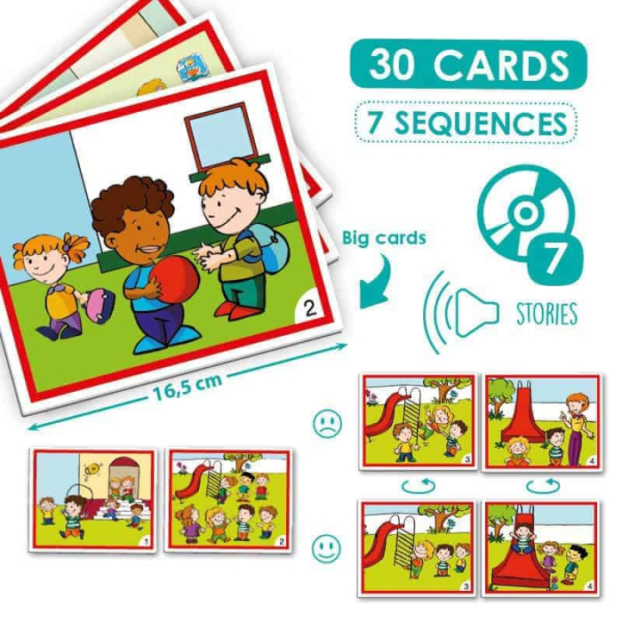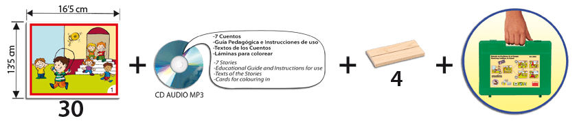 Setul este alcatuit din CD MP3 care include 7 povestiri cu doua finaluri diferite si 30 de cartonase ilustrate mari (16,3 x 13,5 cm) cu un program de auto corectie. Contine un ghid pedagogic cu textele celor 7 povestiri. CD-ul include diferite limbi pentru facilitarea studierii altor limbi straine. Durata aproximativa a povestirilor este de 20 minute.
